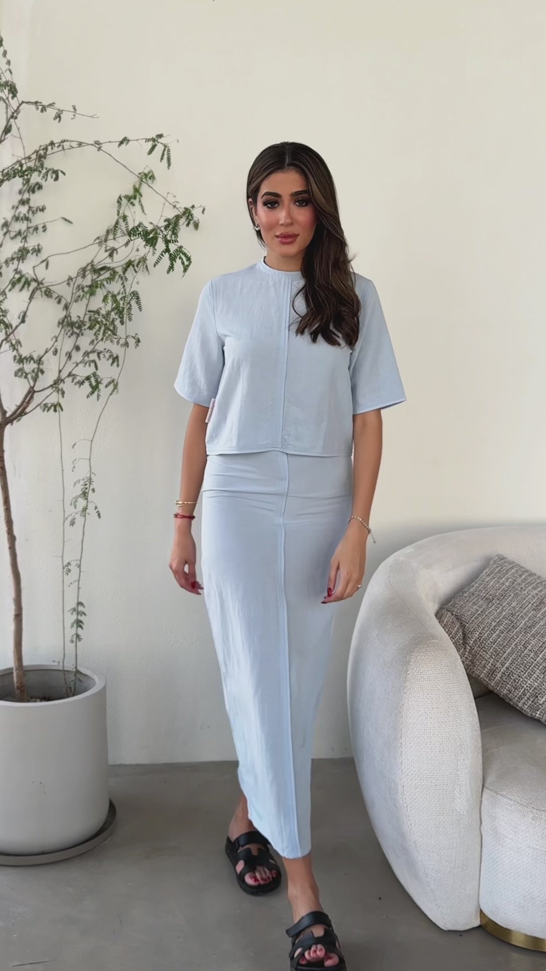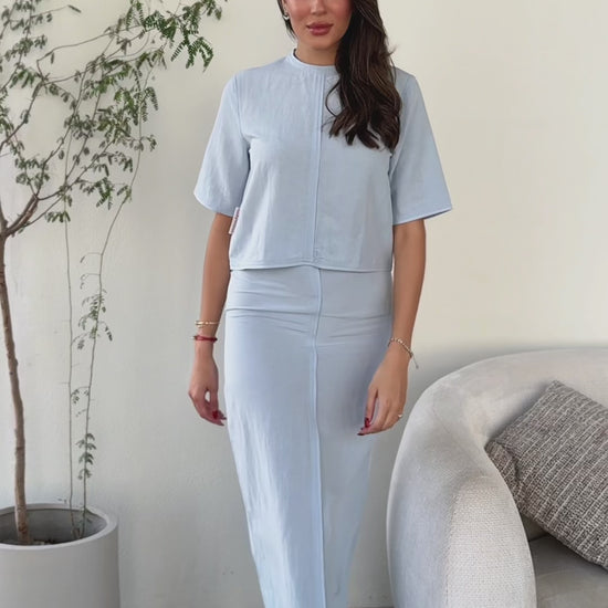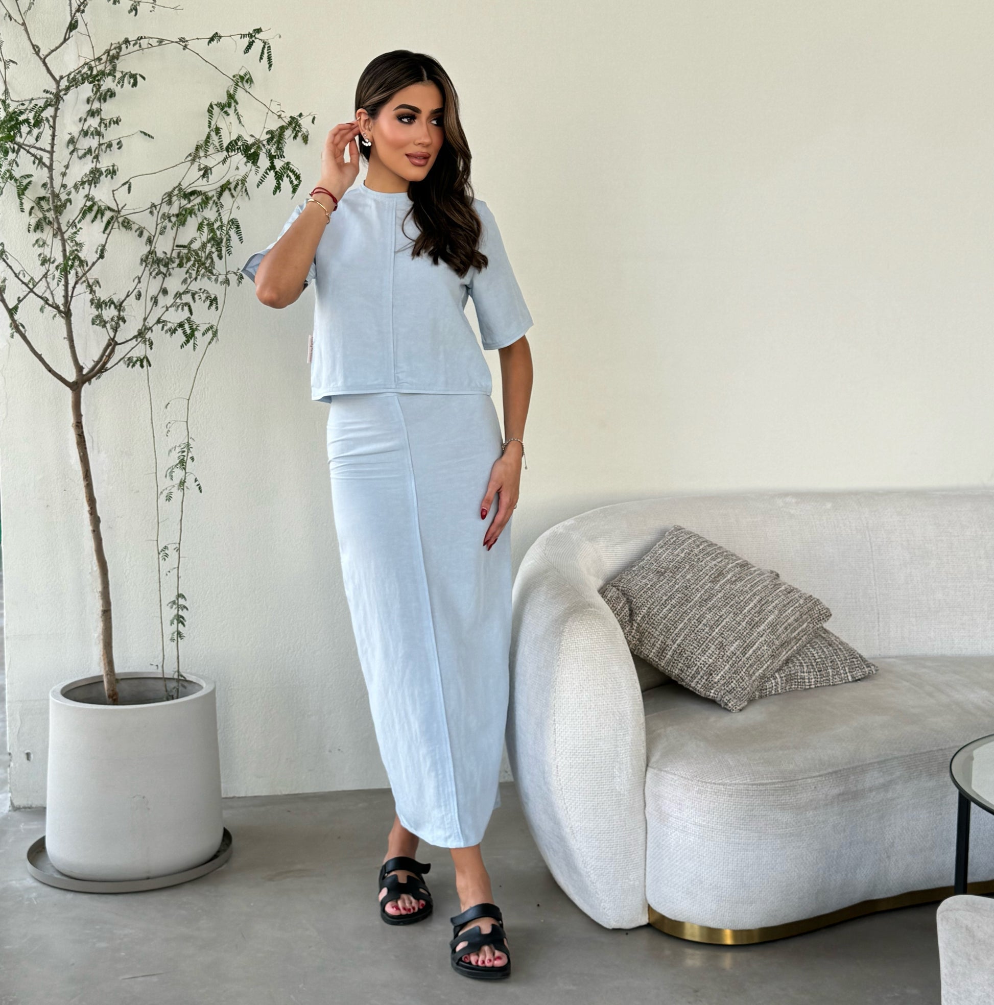 A suit consisting of a shirt and a skirt made of high-quality summer linen, and an opening in the skirt at the back to help you walk comfortably. It is preferable to take a size larger than your normal size.