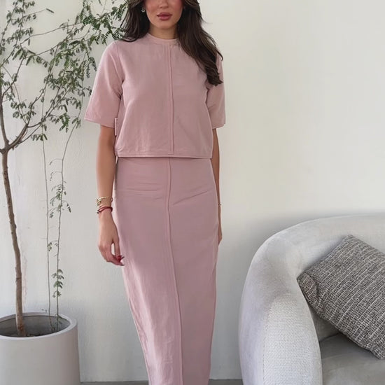 A suit consisting of a shirt and a skirt made of high-quality summer linen , and an opening in the skirt at the back to help you walk comfortably. It is preferable to take a size larger than your normal size.